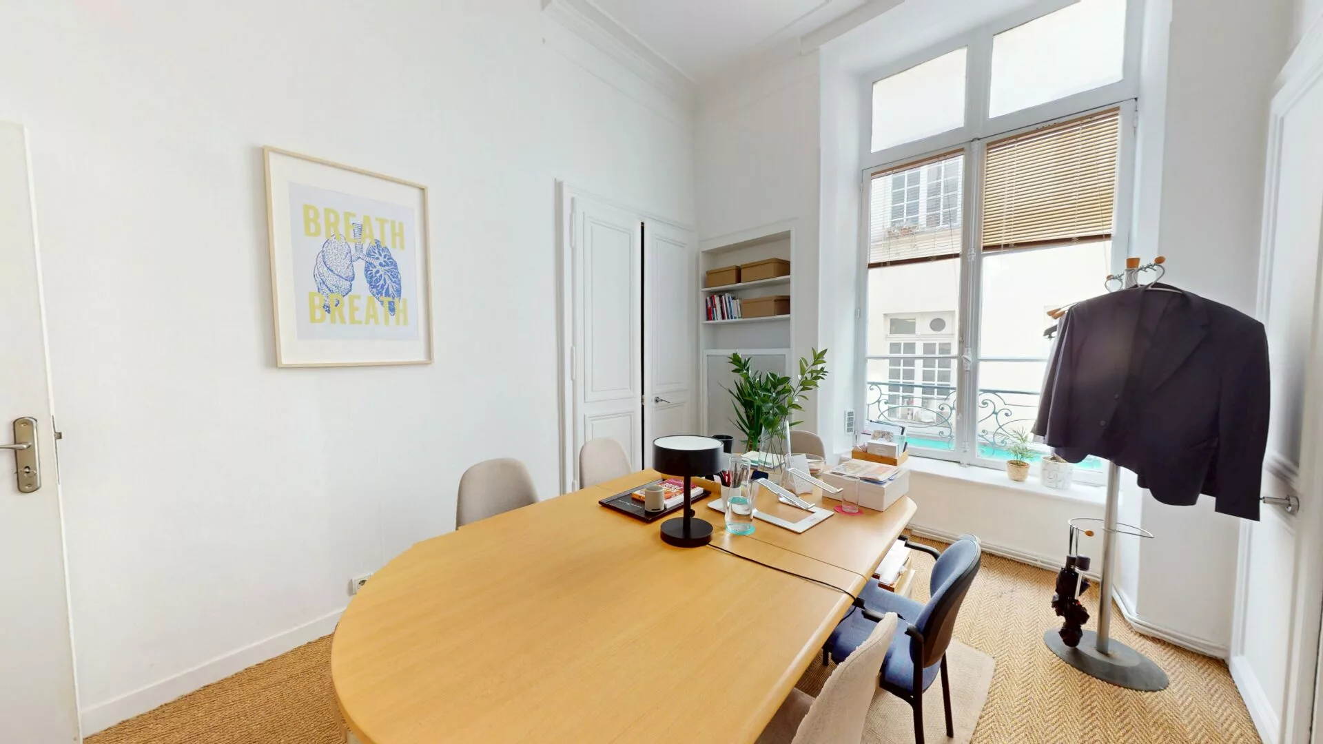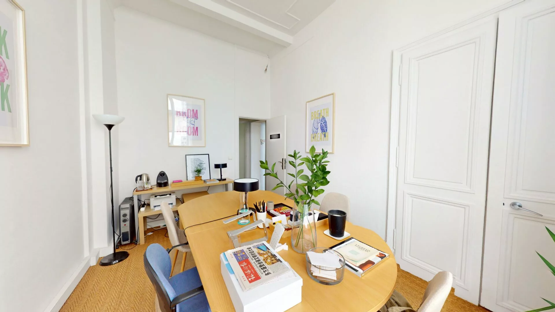Cette belle salle donne sur une rue très calme. Avec sa table ovale, elle peut accueillir jusqu’à 6 personnes. Elle est donc idéale pour vos réunions, rendez-vous, coaching ou autres.